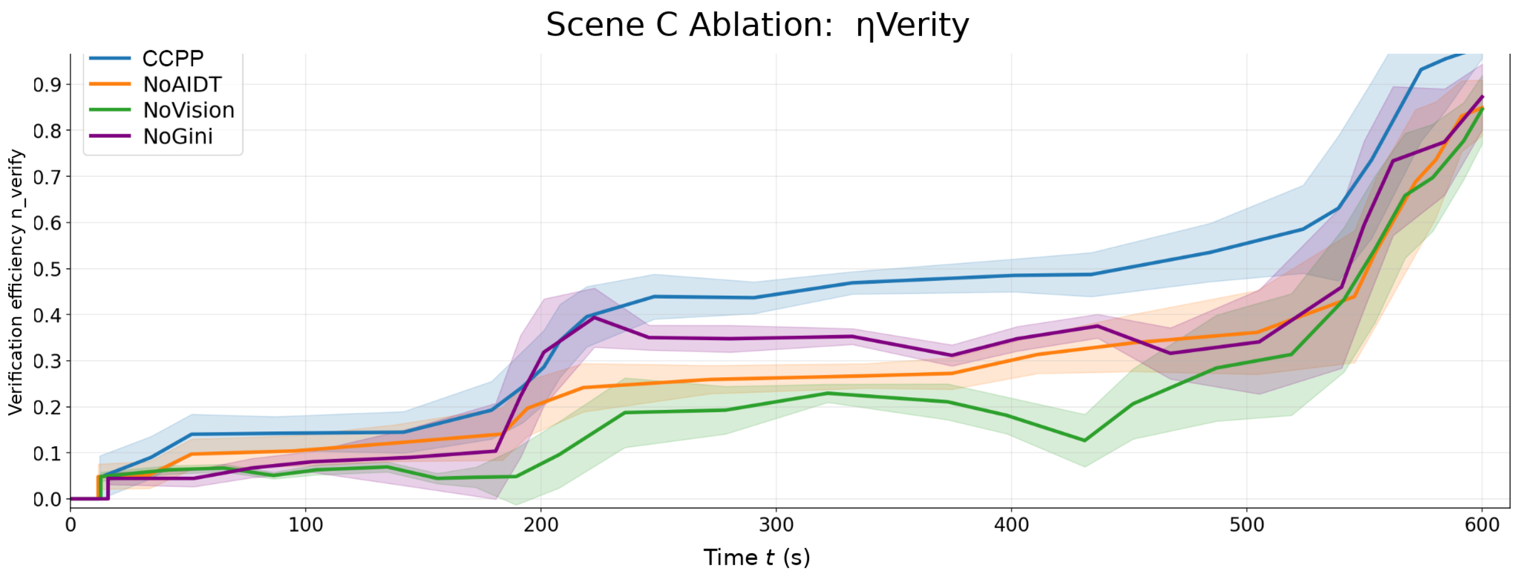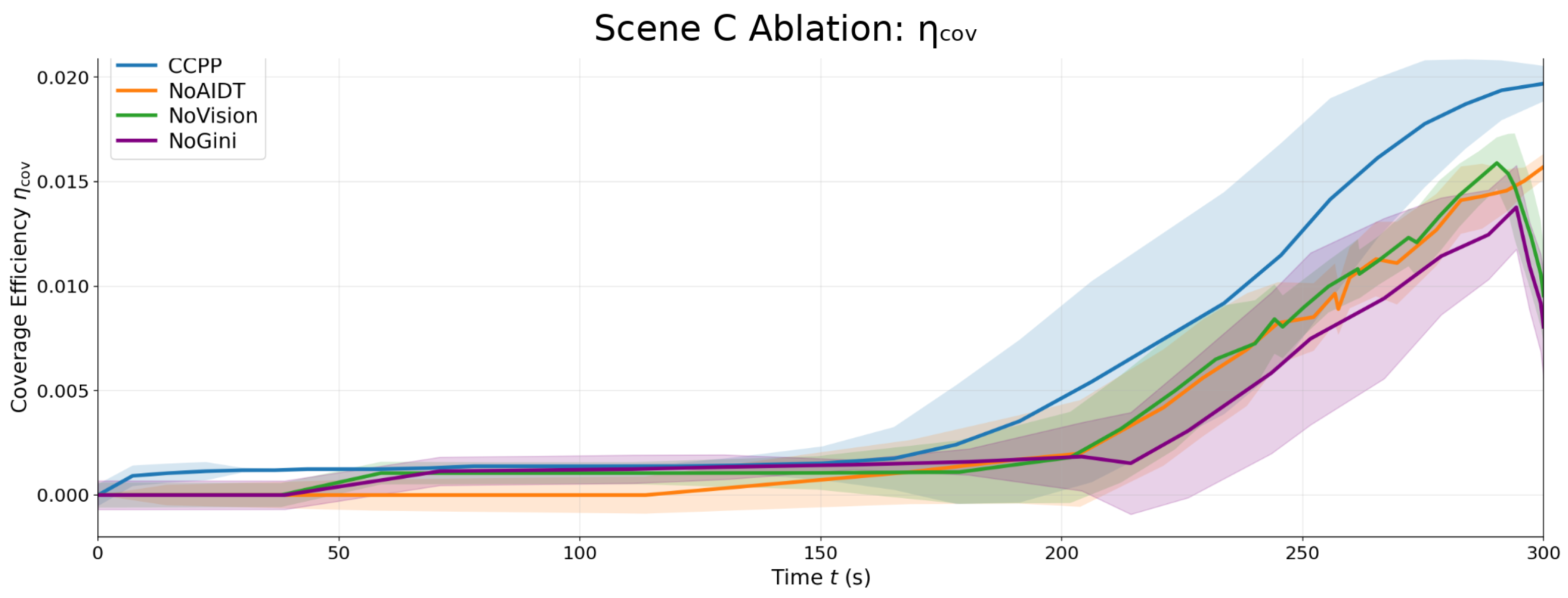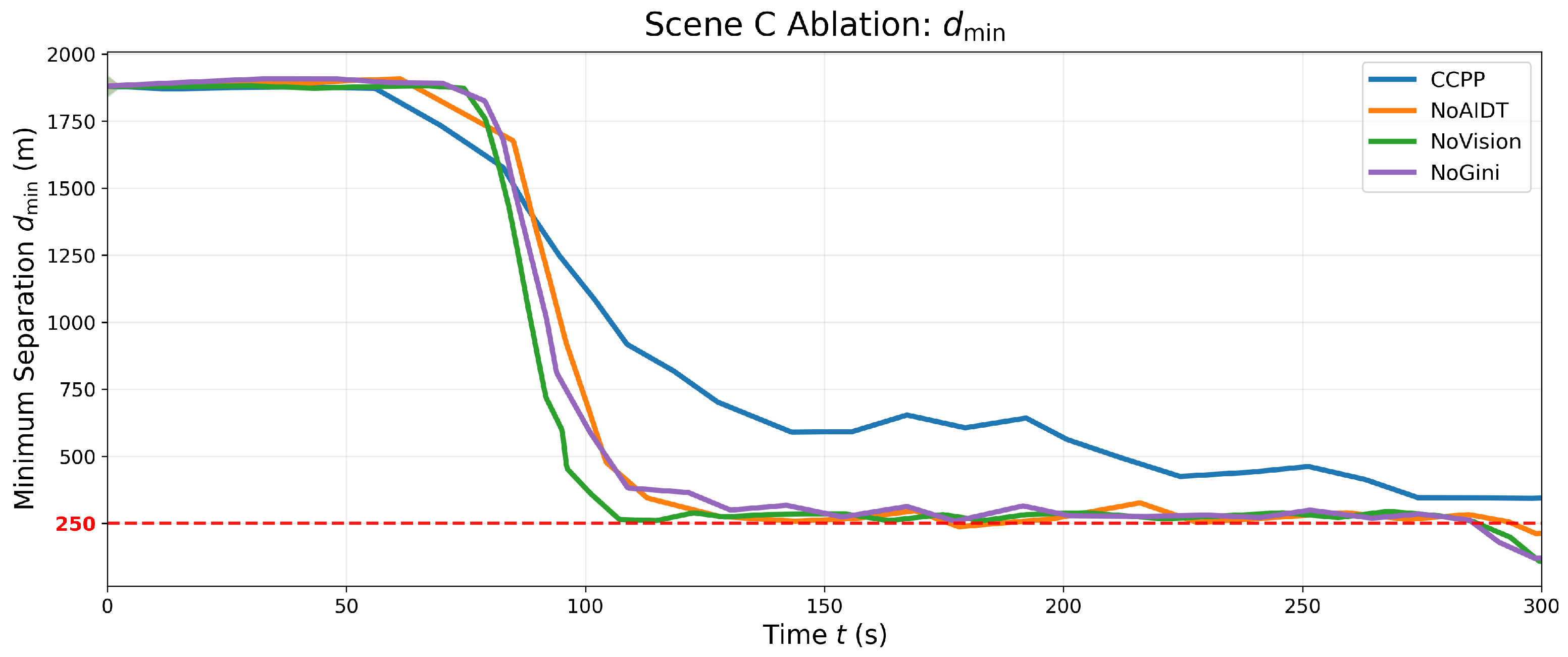 , indicating insufficient structured representation of dynamic risks and uncertainties without the vision–planning interface; NoAIDT stays below CCPP throughout, suggesting weaker online replanning due to the absence of the AIDT meta-policy for efficient mode switching and weight guidance; and NoGini briefly approaches CCPP around 200–