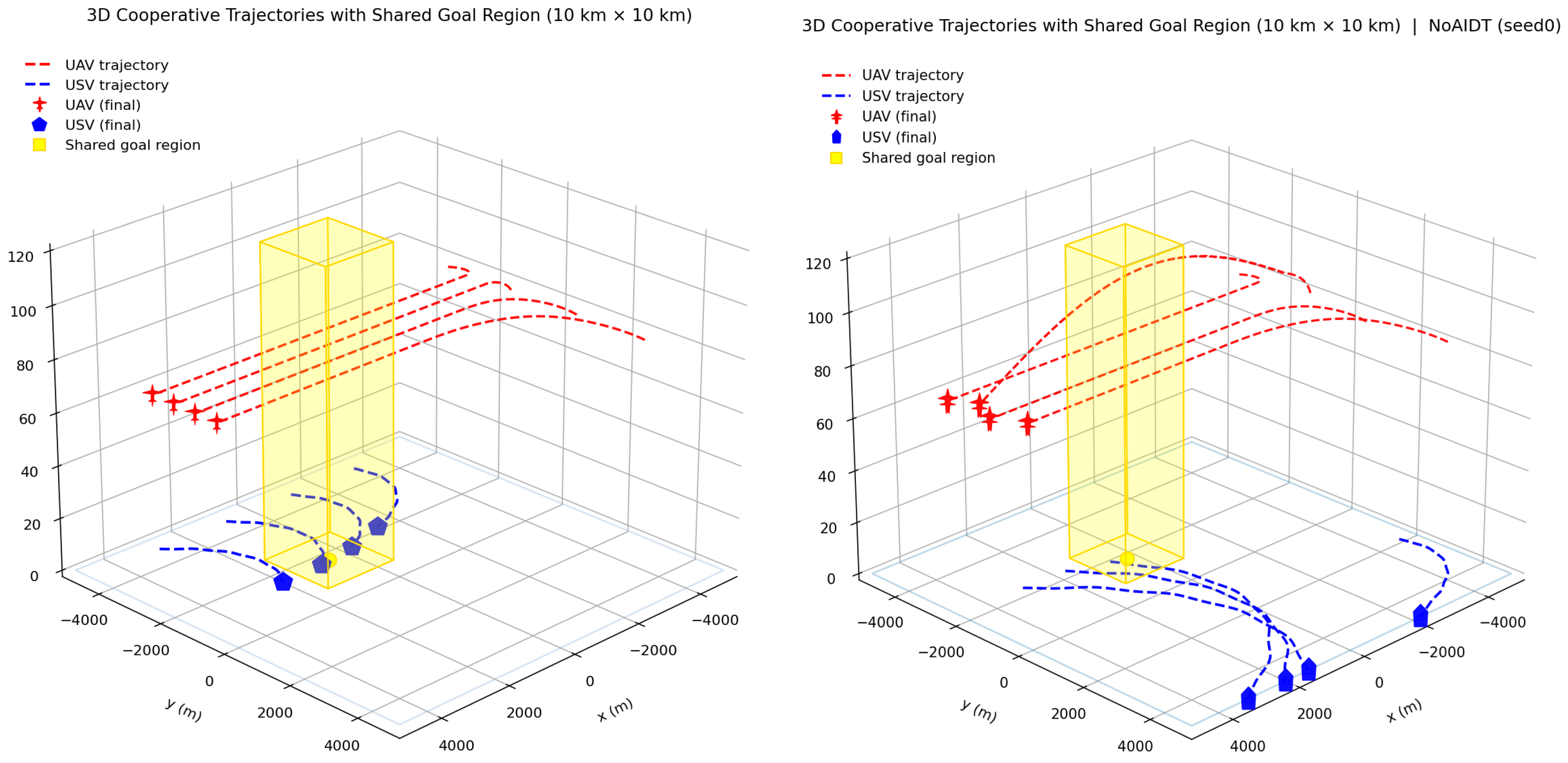 Table 6, the proposed joint path–speed optimization scheme exhibits clear overall advantages over the decoupled sequential variant in the most critical aspects of heterogeneous cooperative planning. In terms of temporal coordination, the joint scheme reduces the synchronization indicator