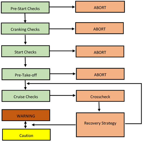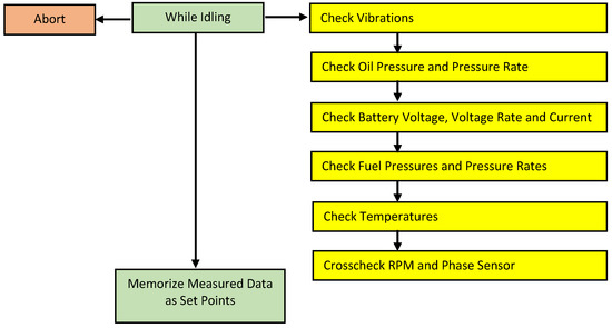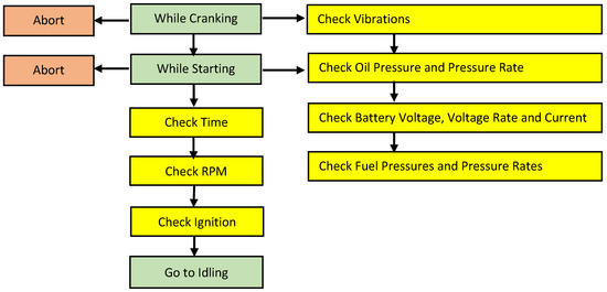 Figure 2 shows the basic controls during the cranking and starting (firing) phases. During cranking, vibrations are checked along with oil pressure, battery, and fuel parameters. Values and gradients are relevant. If something is out of the prescribed limits the warning light turns off and the firing phase does not take place. During firing (starting) the basic checks are the same but the vibrations. Ranges and limits are different. Time to start is carefully checked along with rpm and ignition. If everything goes fine, the software enters the idling monitoring phase. It something goes wrong, the engine is turned off and the master warning light turns on.