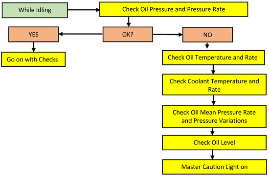 Figure 4 shows the algorithm of the low oil pressure. The oil pressure in an engine is the most critical parameter. Therefore, it is a good example of cross-check and diagnosis. In cruise diagnosis, each measured value has its own specific software to cross-check and proper corrective action. In the example of Figure 4, if the oil pressure goes to zero (below a certain value) the engines stops immediately. In this case, the loss of power is evident and the engine monitoring system is no more necessary. In case of low pressure or of a sudden drop in pressure, cross-check are necessary. It is possible that the engine is overheating. This fact can be seen by the coolant and exhaust temperatures. Another possibility is a partial occlusion in the ducts before the pumps. In this case, the engine will overheat and coolant temperature will show the problem. It is also possible that there is a leakage in the oil system. This leakage can be internal or external to the engine. In this case, the oil level will detect the problem. In all this cases, the master warning light should be put on with the diagnostic chosen for the case. The message is critical for flight safety and human factor. If possible, the pilot will reduce throttle. It is also possible that the pressure sensor is faulty. In this case, cross-checks will diagnose the problem and only the engine service light will be turned on.