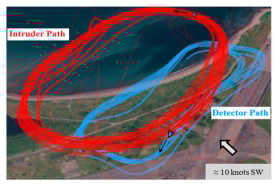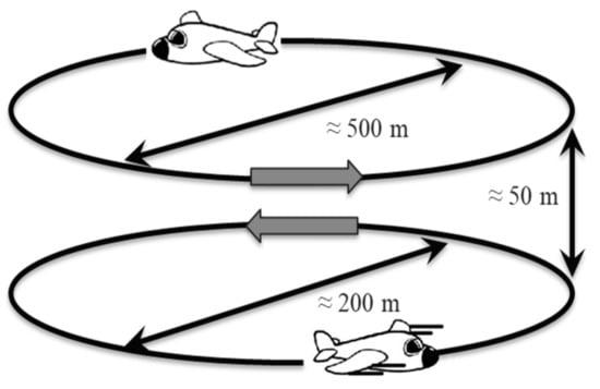 The conducted experiment involved flying two aircraft (sensing and intruding) in circuit formation with opposing flight paths to facilitate close mid-air encounters. The aircraft were assigned different altitudes and circuit radii to avoid any actual mid-air collision from taking place. The intruder was given an altitude of 150 m with a circuit radius of approximately 500 m, while the detecting aircraft was given an altitude and circuit radius of 100 m and 200 m, respectively. Figure 1 and Figure 2 provide a depiction of the experimental setup and a Google Earth image of the aircraft GPS tracks. The total duration of the experiment was 830 s and consisted of 25 close encounters.