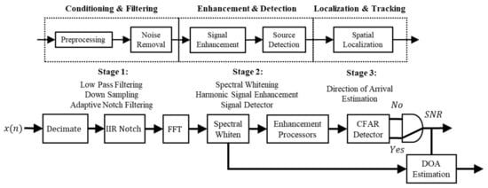 Once the acoustic signals had been digitally acquired, various processing steps were implemented to enable source detection and spatial localization. The required processing steps may be sectioned into three main stages with each stage containing multiple sub-operations as depicted in Figure 6. The major processing operations consist of: (1) conditioning and filtering; (2) enhancement and detection; and (3) localization and tacking. Recorded signals were first decimated to reduce data processing requirements since the recorded sampling was 48 kHz, but only information to up approximately 1000 Hz was found to be useful. The sample-reduced signals were then notch filtered to remove narrowband self-noise components using the referenceless adaptive Infinite Impulse Response (IIR) approach previously proposed by Tan [,,,]. The filtered signals were then windowed, frequency transformed using the Fast Fourier Transform (FFT) operation, and spectrally whitened via the Constant False Alarm Rate (CFAR)-enhanced method previously presented by Harvey and O’Young []. This procedure was performed to transform the broadband noise components to an equivalent distribution type to facilitate the use of the distribution-free CFAR (DF-CFAR) detector as proposed by Sarma and Tuffs []. Prior to performing detection operations, signals were first enhanced using the proposed Harmonic Spectral Transforms, which increase detection capabilities by exploiting the presence of multiple data channels in conjunction with the peak periodicity associated with harmonic signals in the frequency domain. Finally, if a target source signal is found to be present, the direction of arrival (DOA) may be estimated using an approach such as the steered response power (SRP) method. It should be noted, however, that details regarding localization and tracking of the intruding aircraft are not presented in the current paper due to the increased length it would entail; they will instead be presented in a future paper along with a beamforming method, which exploits the harmonic nature of signals to enhance DOA accuracy.