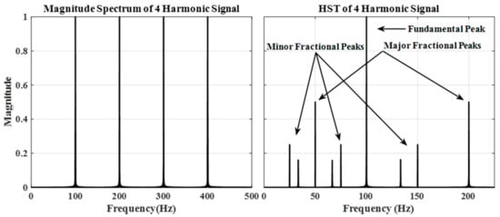 Figure 7 provides spectral plots of the FFT magnitude and standard mean HST  for a signal containing four harmonic components. From the plots, it is evident that the HST spectrum achieves a maximum at the fundamental frequency since all harmonic components are directly combined. It also contains smaller peaks located at frequencies that are fractions of one or more of those harmonic components. The location of all peaks (fractional and fundamental) will be contained in the set generated by: