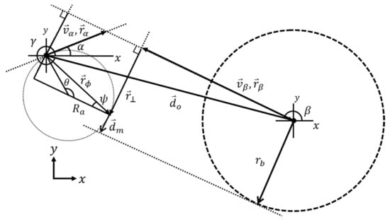 Consider the case for a detecting and an intruding aircraft both having constant speeds and headings of  and  respectively. Given the initial angular position  of the intruding aircraft with respect to the detecting aircraft (in the GPS coordinate system), we wish to find the minimum distance  that can facilitate an avoidance maneuver such that separation never falls below the collision boundary radius . We assume that once the intruding aircraft is discovered, the detecting aircraft immediately initiates an instantaneous bank (roll) angle , and holds that angle until it reaches a new heading that is perpendicular to and away from the intruding aircraft’s flight path. Figure 8 provides a visual depiction of the system kinematic configuration. For sake of simplicity, the system is only defined in terms of two dimensions. Although the actual system is three dimensional, the 2-D model can provide a good approximation if the 3-D speed and heading values are projected on a 2-D plane connecting the two aircraft. In this regard, the 2-D model will produce a more conservative estimate, since one spatial degree of freedom is removed that may be used to perform the maneuver.