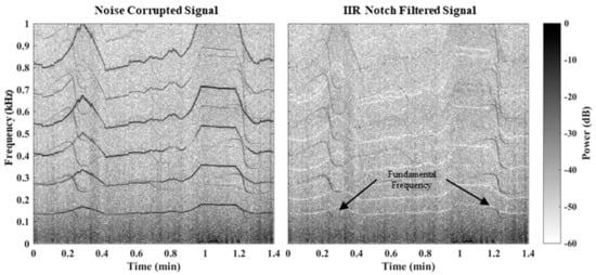 Table 6, Table 7 and Table 8 provide the notch filter, FFT, spectral whitening, and SCDF-CFAR parameters used. Nonstationary narrowband noise generated by the sensing aircraft propulsion system was removed via the referenceless adaptive IIR notch filtering approach proposed by Tan [,,,], since the aircraft engine was running continuously throughout the experiment. Figure 10 provides sample spectrogram plots, which demonstrate the effectiveness of the adaptive IIR notch filtering approach.