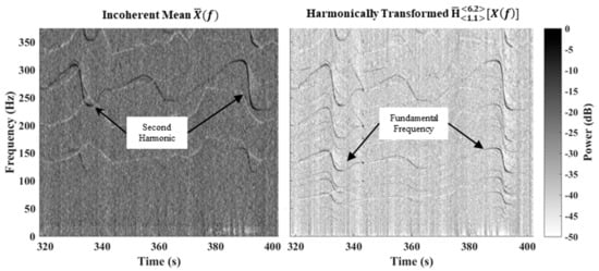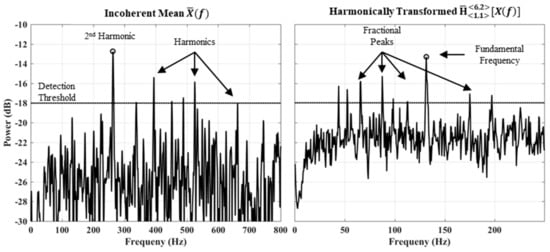 Presented false alarm probabilities for the HST were calculated using Equations (10)–(14). These equations were also used for the incoherent mean to maintain consistency, and because the fractional peak properties of the detection method would automatically exclude surrounding harmonic components from being included in the noise sample estimate. Figure 11 provides sample spectrogram plots of the average power and harmonically transformed signals. It is evident from the HST spectrogram that a large number of fractional peaks are in fact present. In theory, a total of 17 fractional peaks may be present as previously indicated by Table 4. In addition, it is clear the second harmonic component has the highest peak prominence for the incoherent mean form. This is also visible from the sample detection spectra displayed in Figure 12.