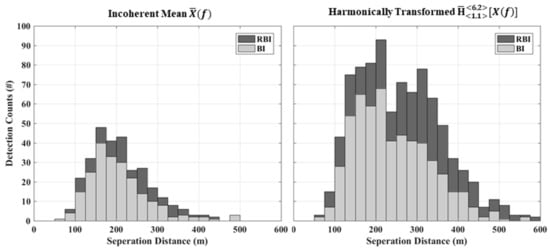 Table 9 provides the detection results for each enhancement processor and detection scheme. From a comparison of the results obtained, it is evident that the harmonically transformed signals produced the highest detectability for all three schemes. The total number of detections were nearly double for all cases, while detection distances were also significantly increased. A total of 1930 detections were achieved for the harmonically transformed signal, with a maximum and mean range of 678 and 302 m, respectively. It is apparent that the single trial (ST) method produced the highest number of detections. However, when considering the false alarm rate associated with this method () as given in Table 8, it is evident that values are too high for this detector to be of practical use. Binary integration (BI) was found to greatly reduce this value to an acceptable level, but at the expense of signal detectability. Since source signals were highly non-stationary as previously discussed, application of the robust binary integration (RBI) provided some alleviation to this issue. This is also evident in a more visual form via the histogram plots displayed in Figure 13. From the plots, it is visible that the RBI scheme provides a significant detectability increase in the 200 to 350 m range. This result is significant since this region dedicates the lower limit at which another UAV can be detected with adequate distance to perform an avoidance maneuver as previously indicated by Table 5.