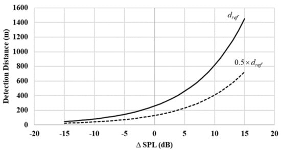 Consider, for example, a Cessna 185 that has an SPL of approximately 130 dB providing a  level of 15 dB compared to the Giant Big Stik UAV []. According to Figure 14, the aircraft should be detectable somewhere between approximately 800 and 1400 m away. When examining the minimum detection distances required to avoid a collision as previously presented in Table 5, it appears the aircraft should have been detected with sufficient distance. Such results are also found to agree with that previously presented in []. Conversely, aircraft with a lower operating SPL, such as smaller UAVs, would be detected at shorter distances as indicated by the plot. Ultimately, experiments are required for a range of aircraft types to determine maximum detection distances, since the presented values assume ideal propagation conditions, which ignore effects such as wind, temperature gradients, ground conditions, etc.; all of these may reduce the actual detection distances.