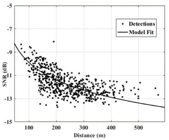 Figure 15 provides a plot of the SNR with respect to distance for each detection point. Since it was previously established in [] that , the observed values may be modeled using the acoustic attenuation laws according to: