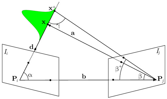 and can directly be obtained given a calibrated camera. The vector from the second projection center to the 3D point is , exploiting the base vector between both camera. This allows us to define the angle between the base vector and the direction as