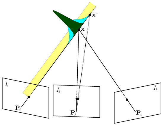 where is obtained by back-projecting the uncertainty of measuring the point in the image plane from image . Figure 3 shows an illustration of the estimation.