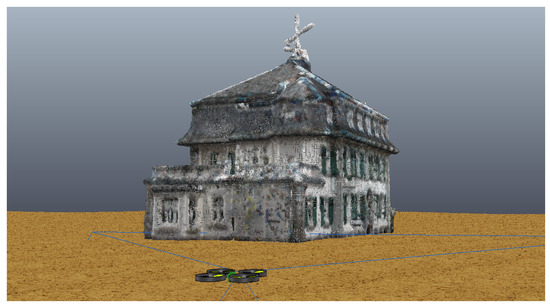 Simulated environment in V-REP simulator. The scene contains the Frankenforst building and the MAV.