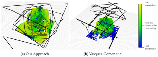 Result of the execution of our algorithm (a) and the approach by Vasquez-Gomez et al. [29] (b) after 40 computed viewpoints. The black line represents the trajectory and the model in the center is the result of the mapping. The voxels are colored according to their uncertainty.
