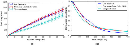 (a) path length at each selected viewpoint; (b) map uncertainty versus traveled distance.
