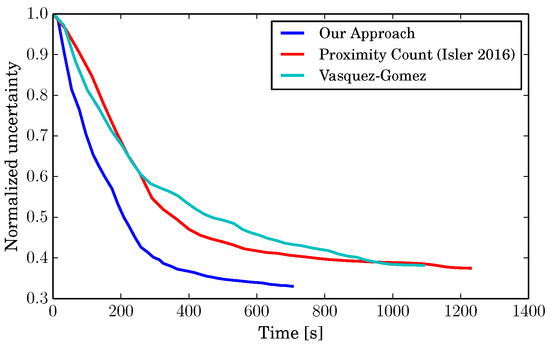 The final comparison we make is between the execution time of the three approaches. Table 2 shows the average time spent to compute the next viewpoint on a single core of a regular Intel Core i7 CPU. In our tests, our approach performed about five times faster. In addition to that, Figure 10 shows the uncertainty against the elapsed time. As can be seen, our approach reduces the uncertainty faster while the time elapses and it is fast enough to be used in real time.