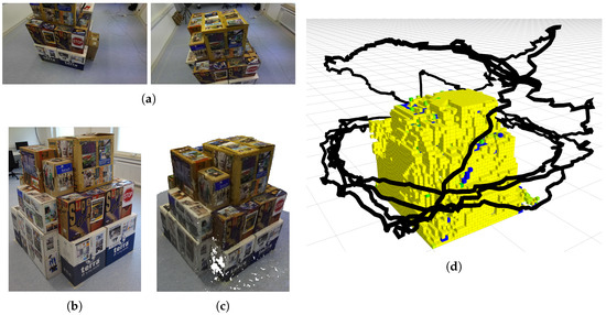 We finally provide a test of our algorithm in the real world. We created a test environment composed by a structure of boxes in an indoor scene (see Figure 12b). The sensor we use is a ZED stereo camera by Stereolabs (San Francisco, CA, USA), which provides, out-of-the-box and in real time, the depth information computed from the stereo images. We run our algorithm with similar settings as the simulated tests, eventually scaled to the size of the new environment. In particular, we used the same weights for the cost function (see Table 1) and sampled the same number of candidate next viewpoints at each iteration (100), but we increased the map resolution by reducing the voxel size to 0.05 m per side, and we reduced the distance of the hull (representing the action space of the robot) from the occupied voxels in the map to 1 m. Figure 12a shows some frames acquired by the camera during the execution of the algorithm. Figure 12d shows the final map of the structure and the actual trajectory of the camera, after 60 computed viewpoints.