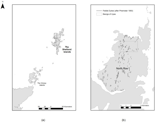 (a) Northern Scotland, the Shetland Islands, (b) North Roe, Northmavine with felsite dykes and the quarry site at the Beorgs of Uyea indicated (Image by the Authors).