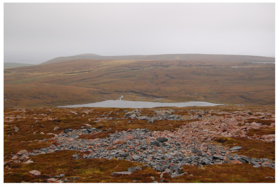 Quarry sites are situated along felsite dykes which are oriented north-south over a 60 km2 region of Northmavine called North Roe. The North Roe quarry complex occurs in and because of a particular geological situation where a series of dykes, predominantly of (riebeckite) felsite have intruded into what is known as the Northmavine pluton. The bedrock is referred to as Ronas Hill granite, a pinkish white granophyritic granitic rock. They occur both across the northern margin of the batholith (referred to as the Beorgs of Uyea area) as well as across the central exposures of the Ronas Hill granite outcrop [7]. Phemister et al. [8] mapped the dyke complex (Figure 1b), and noted that axes and knives (known as Shetland knives) from the suite of reibeckite felsite dykes had been found throughout Shetland but suggested that the dykes at North Roe had not been quarried because of their remoteness. Ritchie [9,10,11] provided the first archaeological assessment of the quarry and the axes and knives from it, now recognised as the source for Group XXII (reibeckite felsite) in the British scheme for the petrological grouping of stone axes. The best known area of the quarry complex with the highest concentration of felsite dykes which were worked is at the Beorgs of Uyea (Figure 2).
