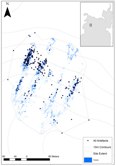 The Shetland Islands lie 160 kilometres north of mainland Scotland. Situated northeast of Orkney and west of Norway, the islands are rich in prehistoric and Viking archaeology (Figure 1). As the northernmost part of Europe where farming was practiced during the Neolithic (3800–2500 BC), it has been the subject of a number of recent projects including the Northern Worlds Project by the National Museum of Denmark [1,2] and the North Roe Felsite Project (NRFP), a research project exploring the extraction, manufacture and distribution of Neolithic polished stone tools [3,4,5]. During the Neolithic period, a distinctive blue-grey rock called (riebeckite) felsite was used to manufacture ground and polished stone axes and knives which are found throughout the Shetland archipelago but apparently not further afield. This rock was quarried from north-south running felsite dykes on the slopes and the area north of Ronas Hill, Northmavine, the highest point on the islands. The isolated location of these quarry complexes has resulted in the exceptional preservation of material with artefacts, debitage and knapping episodes clearly identifiable on the surface. The quarry sites offer an insight into the extraction and initial stages of the production of stone tools at a unique resolution, while the distribution of the ground and polished artefacts across the archipelago is an interesting example of an insular distribution network in a closed economy [6].