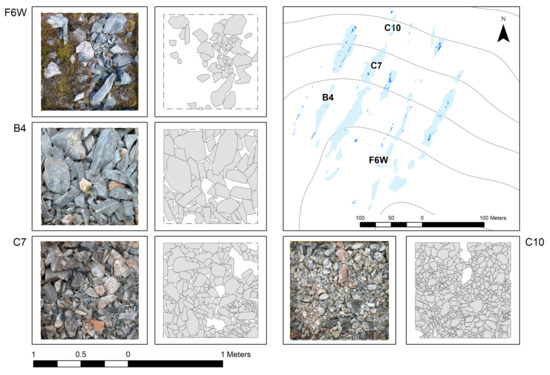 As discussed in Section 1.2, stone tool production sites have been characterised using a range of different approaches including debitage extent, location, size and its association with artefacts. Figure 7 and Table 2 display and record the size and extent of the debitage in four sample areas, as well as their rugosity statistics. There is a relationship between the percentage of debitage cover, the mean size of debitage material and the mean rugosity in the sample area. While the rugosity index is effective in recording the texture of large and medium sized debitage (F6W and B4), it is less effective with smaller material (c.0.3–0.15 cm2) (C7 and C10). This is to be expected due to the resolution of the model.