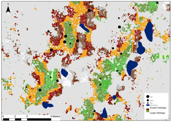 Weisler [16] has suggested that sites can be best understood by exploring material extent, concentrations and the location of tools including hammerstones, blanks and preforms at each quarry. While the survey at the Beorgs of Uyea site recorded different types of artefacts, those surveyed in the felsite extents can be explored in relation to rugosity. In Figure 5, rugosity values have been binned based on minimum and maximum values and the mean values in Table 2. A visual analysis of the distribution suggests that the majority of artefacts are in areas near the dyke quarry faces. A more detailed study of hammerstones plotted by size (small, medium and large) is presented in Figure 8. While smaller hammerstones are found throughout the site, larger ones are in areas of bigger material. Table 3 records statistics for the four artefact types. In total, 121 artefacts were surveyed within the extents of the felsite debitage. Mean rugosity values suggest that other artefacts tend to be found in areas of smaller debitage; however, it should be stressed that the range of values is quite high, indicating a wide spread across debitage sizes.