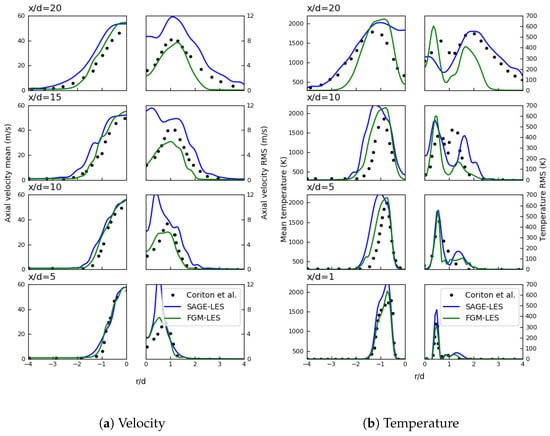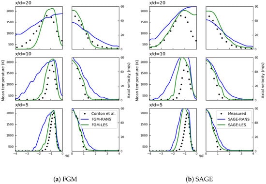 Comparison of LES/FGM and LES/SAGE computed and experimental radial profiles of the mean and RMS of axial velocity and temperature.