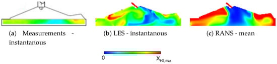 A comparison of LES and RANS simulation results to the experimental data from [25] (Figure 3) shows that near the end of the injection and the compression stroke the mixture vary between the simulations. At CA, maximum fuel concentrations in the cylinder can be considered to be an indication of fuel mixing. While the LES showed a maximum value of , similar to experimental results, the RANS simulation showed a maximum concentrations reaching . The RANS results shows more regions of higher concentration alongside areas to which the fuel has not reached. In contrast, the mixture that forms in the LES is more well-spread and similar to that observed in experiments. When considering combustion modeling the distribution of fuel is essential, and RANS will yield significantly different results, so that correct prediction of the fuel mixture propagation is essential for reacting flow simulations.