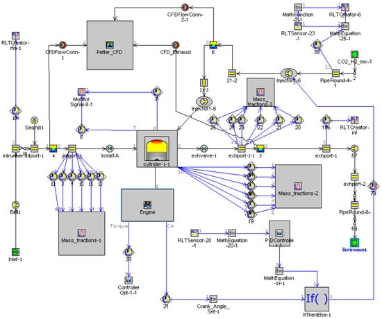The RefCCI engine is based on a two-valve Lister-Petter AD1 diesel engine, converted to directly inject reformate—H and CO—with a port injection of DME. 1D simulations using GT-Power were used to calculate boundary and initial conditions for 3D RANS and LES computations. The CFD model was developed based on a 1D model of the engine built by Eyal and Tartakovsky [16] using the commercial software GT-Power, and engine specifications are given in Table 2. A PID controller is used to maintain a constant throughout the simulation. Combustion rates are predicted using the Fischer/Kaiser [20] kinetic reaction mechanism in a single-zone combustion model. The Woschni correlation for in-cylinder heat transfer modeling [26] is applied, and injected reformate composition is set to contain molar concentrations of H and CO. Engine load is set by choosing , and different ratios of DME to reformate are investigated. The complete GT-Power model of the engine, including the CFD coupling, is given in Figure 4.