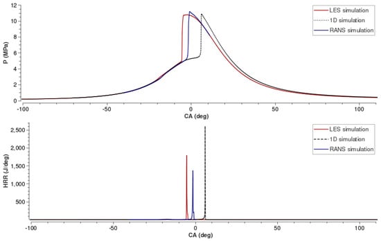 Pressure trace and heat release rate (HRR) comparison of 1D GT-Power model to 3D CFD simulations.