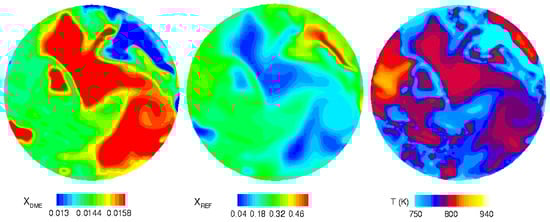 Figure 7 shows the temperature conditions and different fuel compositions right before the early heat release stage at t = −24CA. At this stage, temperatures in the cylinder vary by about 100 K, from 750 to 850 K. The DME-rich regions are warmer, where pre-combustion reactions are beginning to take place. The regions which are rich in reformate have a lower temperature, due to the high levels of CO and lower reactivity. These regions are not yet reacting, with the CO in the reformate further delaying ignition by lowering the peak temperature of the first stage of ignition (the CHO rich stage) [28].
