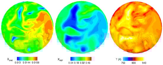 In Figure 8, the pre-ignition stage in the cylinder is shown. The regions that were rich in DME in Figure 7 are now the warmest, as the lower energy C-O bonds are broken before C-H bonds, releasing some energy at this stage and creating the intermediate species [29]. Peak temperatures in the cylinder are reach 1000 K, and vary in range of 200 K which creates temperature stratification in addition to the reactivity stratification of the different fuels.