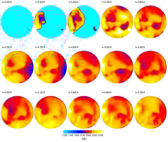 Figure 9 shows the flame propagation during ignition stage. Initially, there are two flame fronts which develop simultaneously (it should be noted that the temperature scale is different to the one in Figure 8). Within less than 0.5CA the flame fronts are joined and temperatures rise above 2200 K everywhere in the piston bowl as reactions take place.