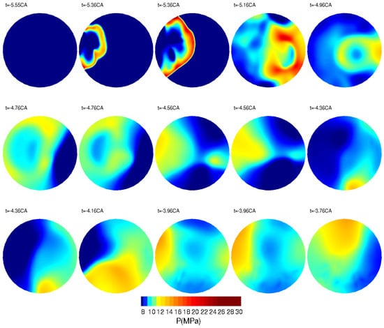 Pressure contours during ignition in a slice of the piston bowl.