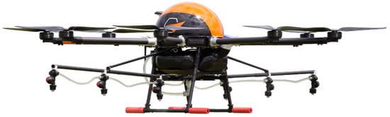 The pulverization drone used in this research is a class 3 [] RPA Pelicano. This aircraft weighs 15 kg, has eight rotors and can carry up to 0.008 m3 (8 L) or 10 kg of fluid to spray at a 0.000167 m3/s (1 L/min) rate over a width of four to five meters []. It flies between one and five meters above the crop and can cover up to 10,000 m2 (1 ha) per flight. This UAV can be seen in Figure 1.