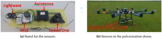 In Figure 2a, it is possible to observe, from left to right, the Lightware sensor, the M16, the Aerotenna and the LeddarOne. The choice of the order was made to improve balancing of the structure around it’s geometric center, thus having small influence in the balance of the carrying drone. It can be noticed that the sensors are not capturing the exact same point due to the lateral positioning. This could be neglected due to the applied filtering, which reduced the influence of the plants and because of the very small roll angles during flight. The structure was fixed to the drone’s landing gear using hooks in it designed to fit the landing gear. This structure mounted to the drone is shown in Figure 2b.
