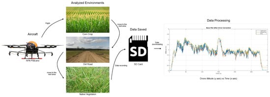 The flight includes parts of dirt road used for takeoff, a corn crop section and a native vegetation area. The system starts recording with the drone on the ground and the recorded data includes the takeoff and landing processes. The data is saved in the end of the flight in a SD Card for further processing. A diagram showing the data acquisition process can be seen in Figure 3 , which represents the key phases.
