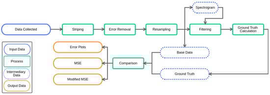 As the workflow shows, the data that is compared to the ground truth is taken right after the resampling stage. This is done to provide a comparison using the unfiltered data provided by the sensor, a situation closer to what would be the desired implementation. Since the filtfilt implementation is, by its nature, anti-causal, meaning that it cannot be implemented in an online basis, using the data filtered by it would not represent the actual result the sensors would give in a real application.