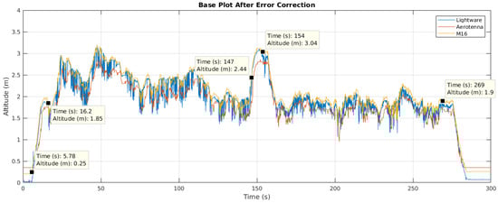 Following the workflow presented in the Section 4, a flight was performed over the crop field started by a takeoff phase over a dirt road. The drone was, then, driven to the crop flying over plants, plantation gaps and service corridors. The culture in use in this part of the data was corn with approximately 40 days, measuring 0.5 m in average. The aircraft flies then over the dirt road and follows to a native vegetation area. This area can be separated into two regions, one of them with heights of approximately 0.3 m and another with heights of approximately 0.8 m. The data collected during this experiment can be seen in Figure 5 which shows the altitude measured by the three sensors versus time.