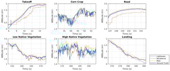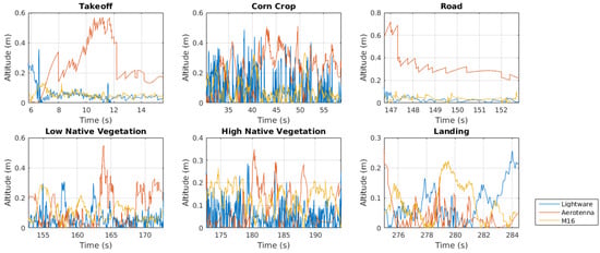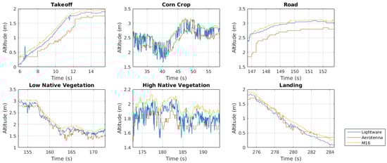 The plot extracted from the takeoff phase shows, as expected by the smoothness of the surface, a soft ascendance on all three sensors. The corn crop extract (mainly the Lightware sensor data) clearly shows a high frequency signal overlapped with a lower frequency one. The lower frequency signal is approximately the real altitude over the plantation, while the higher frequency signal represents the texture underneath, showing accurately variations with amplitudes close to the measurements of the plants. The road and landing flight phases show similar results to the takeoff phase. The native vegetation phases do not show results as bad as the crop phase, probably because of the higher density of the plants. However, there is a clear difference in the amplitude of the oscillations between the high and the low native vegetation.