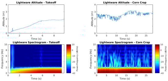 The altitude data followed by the spectrogram for the period of time is shown in Figure 7. On the left the data comes from the takeoff process, which took place at a very smooth surface, thus yielding to a clean signal that can be seen as a target for the filtration process. In these spectrograms, it can be seen that most of the power of the signal and, thus, most of the information of the signal is present below 2 Hz. On the right, the data comes from the section of the flight when the drone was over the crop. In this case, it can be seen that it is a signal with a much higher power in higher frequencies, as expected. Again, this is most prominent in the Lightware data. It can also be noted that around 1.5 Hz the spectrogram starts to be distorted by the crop.