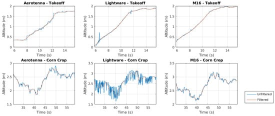 In Figure 8, it can be seen that the data from the smooth takeoff process was not modified by the filtering, while the data from the corn crop is much cleaner, showing little influence from the texture on the ground. It is possible to highlight a fact in measuring the altitude in the corn crop phase, mainly for the Lightware sensor data: The desired altitude to be measured would be the bottom of the negative peaks as this is the altitude with relation to the plants under the drone. In this sense, this filtration enhances the results, but further improvements could be made to provide a result closer to the desired. Also, it is possible to notice that the magnitude of the signals remained mostly unchanged and there was no visible delay introduced by the filtration process.