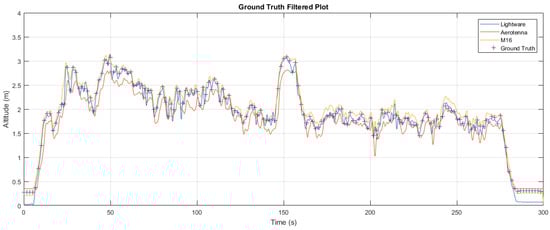 The MSEM in Table 2 shown a similar result to the one seen in the MSE method. However, it can be seen that for results that are visibly closer in plots such as Figure 11, the MSEM provides a better notion of the similarity of the sensing quality provided by the sensors. This is done while still keeping the distance of already distant signals, as shown in the takeoff section. In this time slice, for the Aerotenna, which performs the worse, the MSEM shows results that are very close to the MSE, while the values for Lightware and M16 are much closer to each other, which matches with the visual perception of the data from this timestamp. This way, the MSEM can be used more effectively when deciding the right sensor for each task as it is able to provide a better differentiation of the qualities and similarities of the sensors.