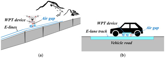 Air gap in dynamic wireless charging systems (DWCS). (a) E-line systems for drones [2]; (b) E-lane systems for electric vehicles (EVs).