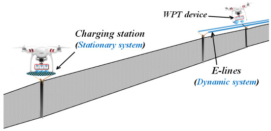Some research efforts have been made to resolve this issue including high performance batteries [8], autonomous battery swapping systems [9], Stationary Wireless Charging Systems (SWCS) [10,11,12,13], in-flight charging (hovering mode) [14], and Dynamic Wireless Charging Systems (DWCS) [2]. The SWCS is a stationary pole, pad, or box type system that recharges a drone battery through wireless power transfer (WPT) methods while landing on its surface [10], and the DWCS is a system similar to the electrified road (lane) for ground electric vehicles [15], in which the drone battery can be recharged by flying (dynamic) over the WPT system which consists of multiple coiled lines [2]. The DWCS presented in [2] is practically feasible for implementation considering the related technologies that are currently being developed [14].