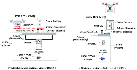 To delineate this uncertainty of the efficiency in the DWCS, we refer to the results from [13]. They obtained the efficiency of a SWCS by varying the vertical and horizontal distances between a drone and a SWCS. As shown in Figure 3, the vertical distance is the difference between the E-lines, and the horizontal distance is the difference between the centers of the E-lines. The stored electricity powered by renewable sources, such as wind and solar energy, is wirelessly transferred to a drone’s battery by magnetic resonant coupling methods [11] through an inverter device embedded in the DWCS, transmitting E-lines on the DWCS, receiving E-lines under drone’s WPT device, and a rectifier device embedded in drone’s WPT device, successively. In this process, the efficiency of the WPT is affected by the vertical and horizontal distances [16].