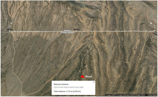 For the case study, we selected a part of the U.S. - Mexico border located in Arizona state in the U.S., having a length of 6 km (A-B) as shown in Figure 4. Over this area, drones are required to conduct surveillance missions (routine flight mission) under the control of the center (Depot).