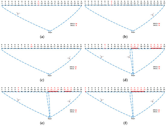 When the value of the DCE follows a uniform distribution over the interval [0.0, 0.5], only the SWCS and one drone (Type I ) are needed to monitor the border area. The drone lands on the SWCS installed at waypoint 12 () and stops its flight for 58 min to recharge its battery. After that, the drone visits the remaining waypoints and returns to its initial launching waypoint (Depot). The total cost of conducting this mission over a given period () is $27,400. This result is also shown when the value of the DCE follows a uniform distribution over the interval [0.1, 0.5] or [0.2, 0.5]. The difference between these results is the location of the SWCS installation. Depending on the location, the flight direction (clockwise or counter-clockwise) changes as shown in Figure 5a–c.