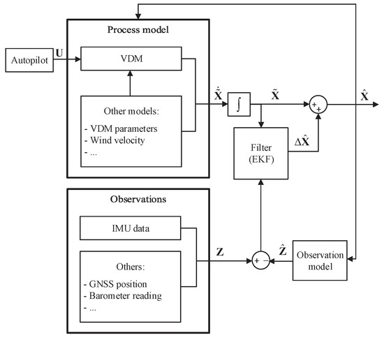 Recently, there have been some research activities aimed at mitigating the problems of navigation during GNSS outages using vehicle dynamic models (VDM) [1,2,3,4,5]. In such navigation systems, the platform dependent dynamic model of the UAV is used in navigation as opposed to the platform-independent approach in INS-based navigation. The VDM is fed by the control input to the UAV and predicts the linear and rotational accelerations. The control input can be provided by different sources, such as the autopilot or the microcontrollers commanding the servos, depending on the architecture of the platform.