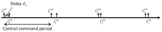 The control commands were separated into two groups: those related to motor propeller speed (rpm) and to the servos (for aileron, elevator, and rudder). The servo and motor rpm commands were assumed to be accessible at 10 Hz, which is the case on the employed UAV. The ideal time-tagging of the data was corrupted by delay for each data set separately. The meaning of the emitted and tagged times is illustrated in Figure 3.