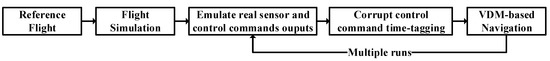 In order to assess the influence of imperfections in data time-tagging on the performance of VDM-based navigation, a simulation scenario was setup. The steps of this simulation are depicted in Figure 4 and are detailed as follows: